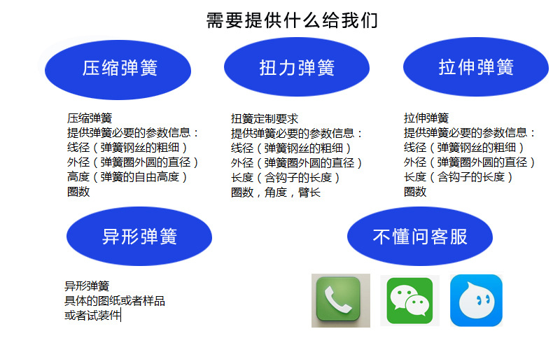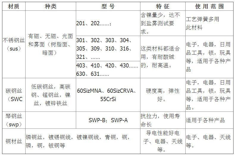 各种材料:不锈钢304,不锈钢316,琴钢丝,