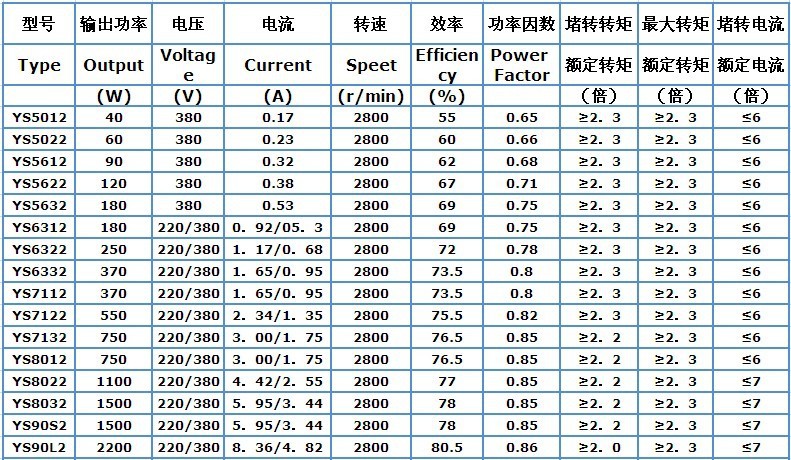 YS系列(AO2系列)Y2系列,技术参数(50Hz、IP44 ,IP5)