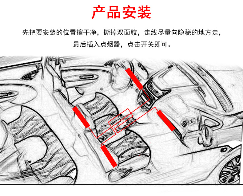 安装:将四个灯分别用双面胶固定,把线藏在脚垫下,将点烟器插头插入车上点烟器接口,按下开关即可,操作非常简单,遥控器是红外线遥控,需要对准接收线头遥控才有效