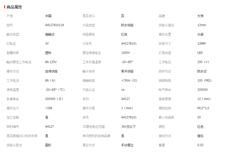 Toowei全防水按钮开关A4127红色自锁带线水下可用8A125V线长16cm