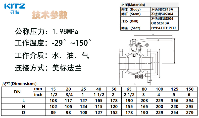 KITZ日本北泽开滋二片式手动304不锈钢法兰球阀门150UTB厂家直销