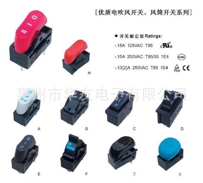(1) QBJ-B电吹风开关,三档:OFF, L-1, L-1-2 两种功率选择。按钮颜色及印字可定制。