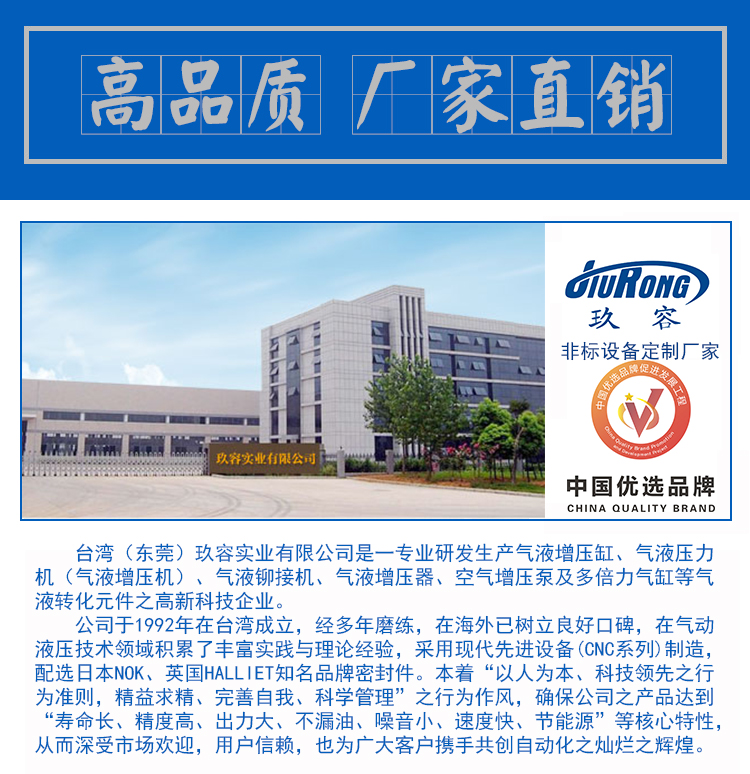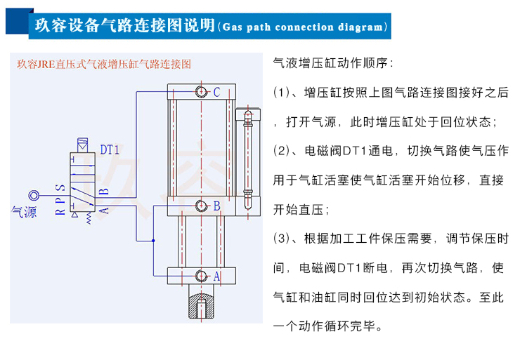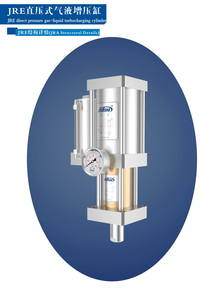 JRE直压式水平安装型增压缸为JRE直压式气液增压缸产品的细分,水平安装款式,直压式水平安装型增压缸产品开始动作就直接增压出力,没有预压行程,类似于气缸,只需要一个电磁阀控制,一般用于5~20mm行程较短的高压出力场合。