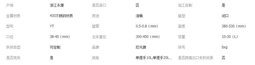 此油桶材质为430不锈钢系列材质,吸铁石可以吸住。不锈钢制品便面会有轻微划痕,介意者勿拍。单柄系列的油桶尾部没有安全阀,三提手油桶尾部带有安全阀。