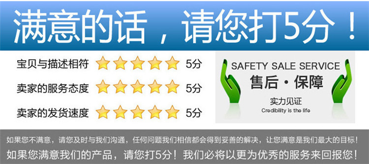 五、产品经检验合格包装后出厂,若运输途中损坏的请勿签收,并及时通知卖家,本店会向物流公司提出索赔,一切以客户利益为重。同时本店会在第一时间为客户重新免费发货。