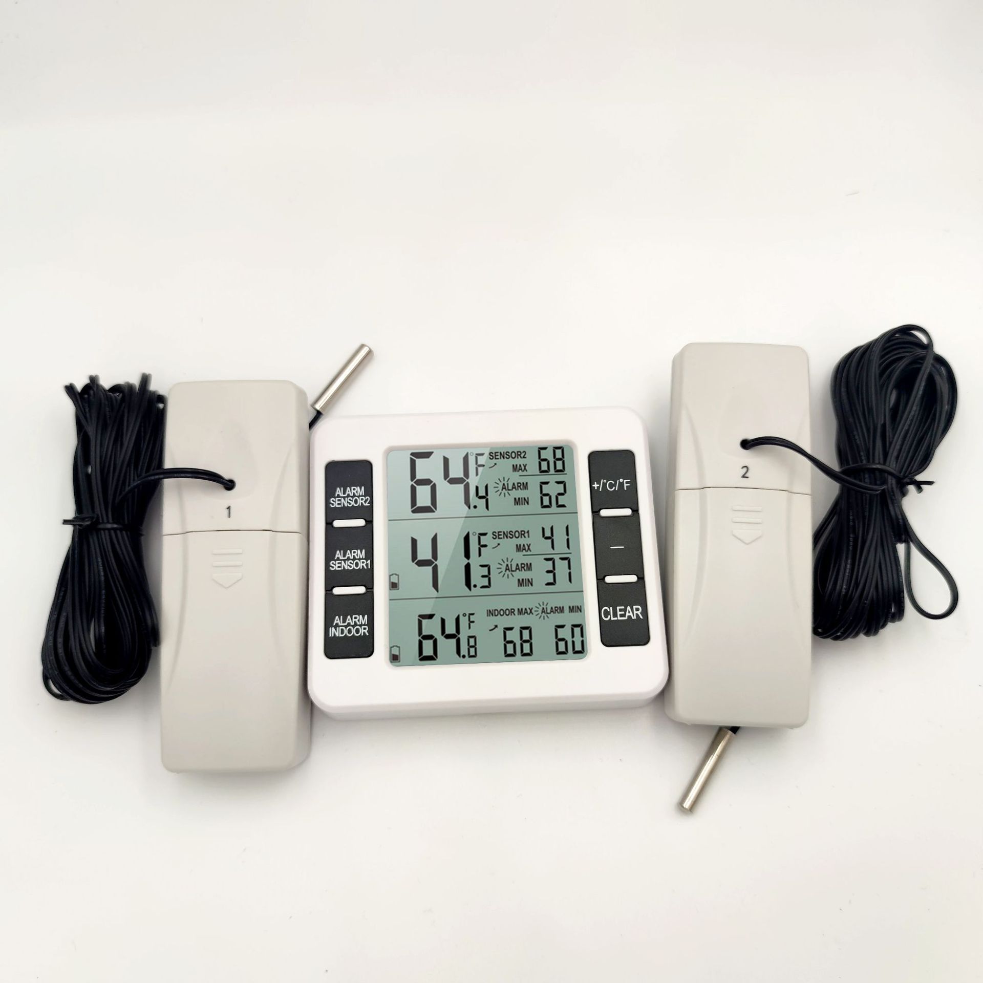 此款温度计可以一拖一(一个主机带一个子机),也可以一拖二(一个主机带两个子机)。同步测量温度。网页标价是一拖一的价格。