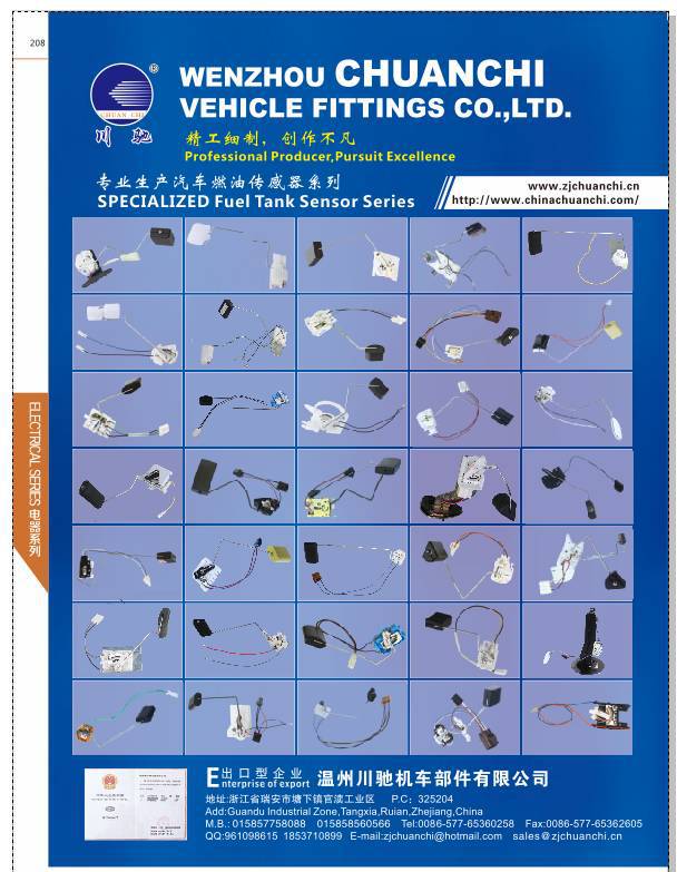 Wenzhou chuanchi vehicle fittings co.,ltd, which was established early in 1990s and is a modernized joint-stock cooperative enterprise specializing in producing charge meter(tank float)for imported and chinese-made motorcycle's and automobile's fuel volume, now has become the leadhorse in the fuel floater trade of development.Taking science and technology as support,emphasizing talent. science and technology and strictly stressing internal quality control according to market demands ,our factory will exert ourselves to develop and produce high quality products to repay society.