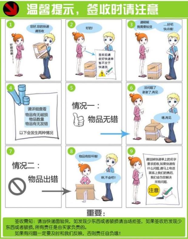 ②在您收到物品快递时一定要拆开包装确保无损坏后再签收,如若发现问题请于24小时内与我们电话联系。