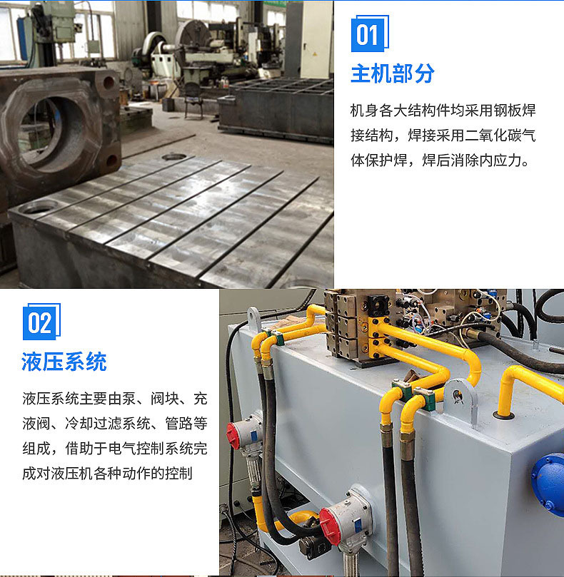 机身由上横梁、活动横梁、下横梁,4根立柱组成。进行去应力处理,缸体采用45#锻件。活塞杆50#锻钢离子氮化。硬度达到HRC45-50机身各大结构件均采用钢板焊接结构,焊接采用二氧化碳气体保护焊,焊后消除内应力。主要部件采用先进设备进行加工,保证整机的高精度。机身预紧采用液压螺母预紧。