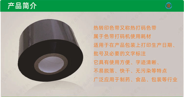 热转印色带是通过色带打码机热、压结合的方式将本产品上的油墨层转印到塑料、纸张、复合薄膜等材料上的一种打印耗材。其适合在食品、药品、乳品等外层软包装表面打印生产日期、批号、重量等标识、标记信息。可对中文、阿拉伯数字、英文等七号以上的字符实现清晰打印,所打印出的字迹具有清晰、牢固、耐刮擦、耐蒸煮的特点。目前,在低、中、高速生产流水线的在线标识方面应用较多。