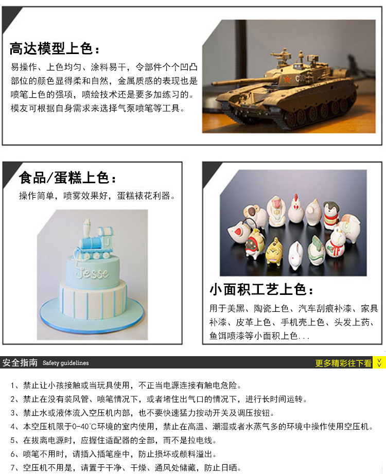 【产品型号】:G-08 +130A 【产品类型】:迷你气泵喷笔套装 【开关方式】:按拉式双动开关 【产品尾柄】:可选择内调、外调(黑色、镀 铬等) 【产品口径】:0.3,可配0.2、0.4、0.5 【喷料杯位置】:上壶 【料杯容量】:7CC 【喷射距离】:50-100mm 【喷射宽度】:5-60mm 【产品规格】:950g 规格20*13*12cm 【工作气压】:15-50PSI 【适配器】:美规、欧规 【最大工作压力】:25PSI |