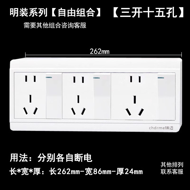 明装开关插座三开十五孔 3开双控带插25孔厨房卫生间一键断电线盒