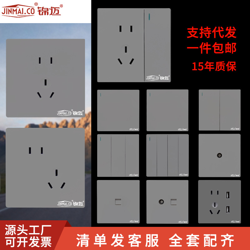 锦迈86超薄家用面板暗装墙壁天空灰usb快充 一开五孔开关插座批发