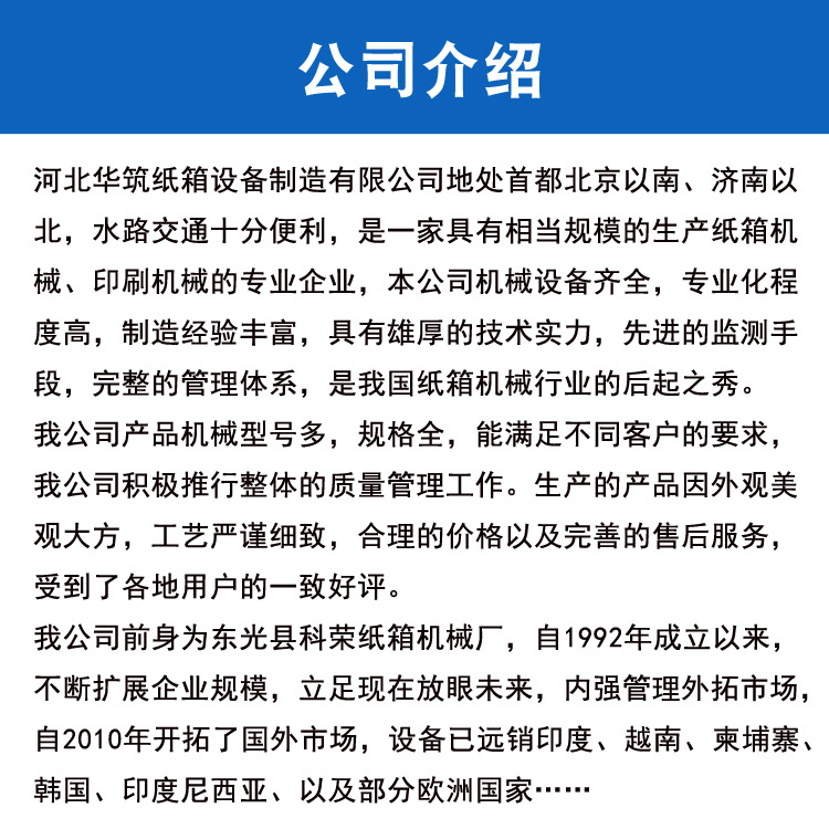 我公司前身为东光县科荣纸箱机械厂,自1992年成立以来,不断扩展企业规模,立足现在放眼未来,内强管理外拓市场,自2010年开拓了国外市场,设备已远销印度、越南、柬埔寨、韩国、印度尼西亚、以及部分欧洲国家,我公司2018年新注册公司名为河北华筑纸箱设备制造有限公司,进一步扩大了企业规模,同时也加大了科研力度,研制出多种新产品类型,获得“河北省科技型企业”等10多项企业荣誉,力求以物美价廉的产品和完备周到的售后服务真正做到让客户买的放心,用的舒心,实现双赢多赢,董事长李树军欢迎社会各界人事莅临指导,共创实体经济发展新台阶
