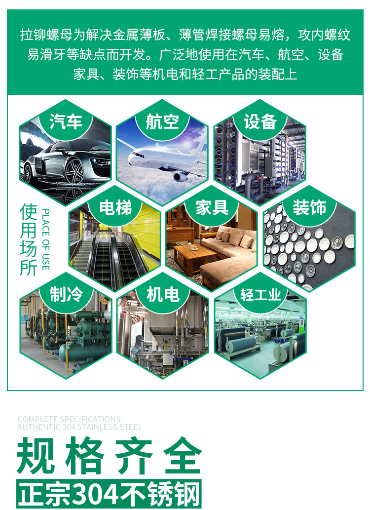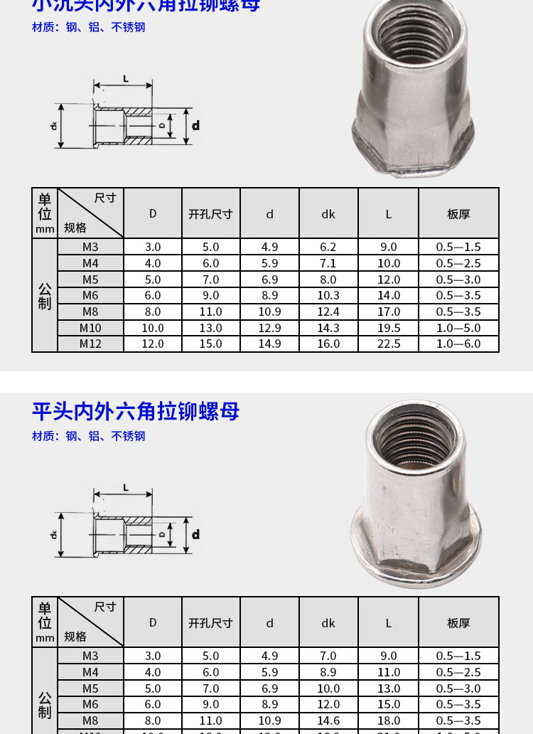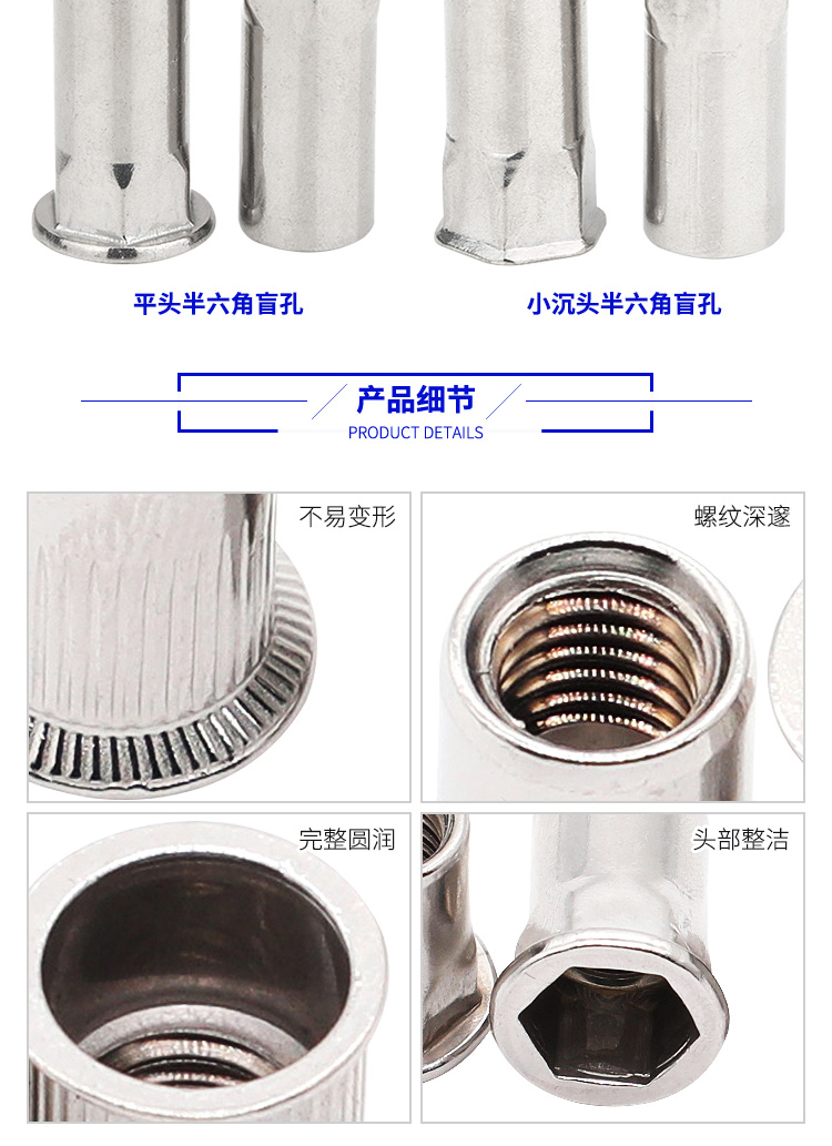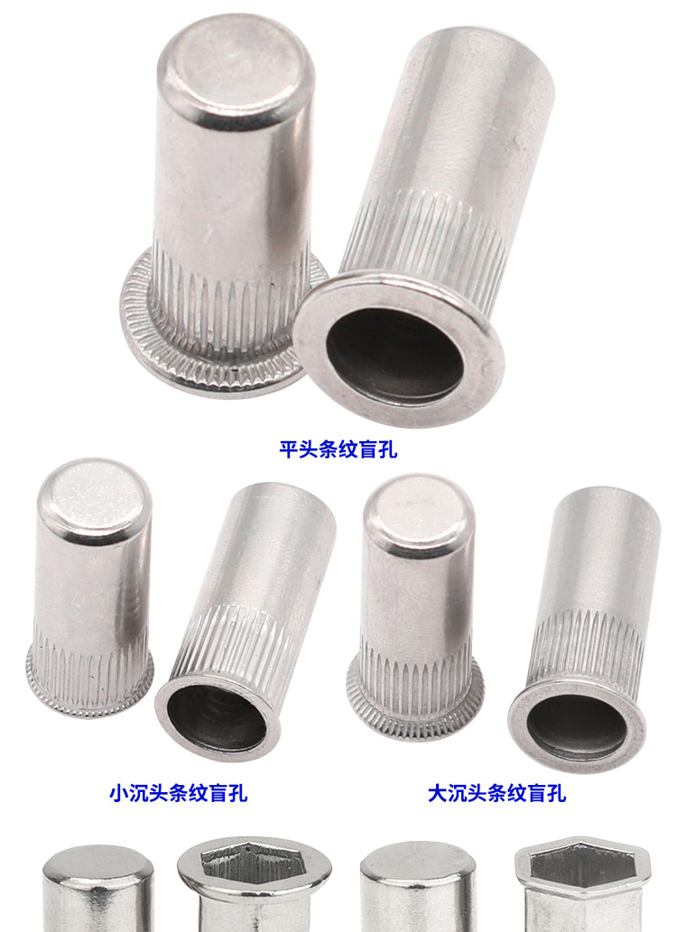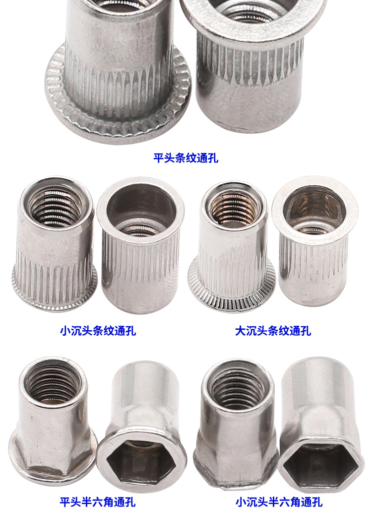 不锈钢304平头小沉头内外半六角条纹螺母拉铆螺母拉铆盲孔M4-M12