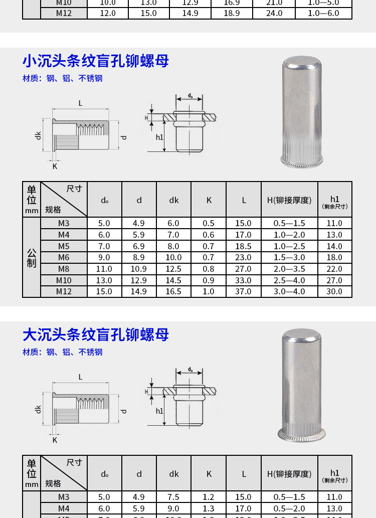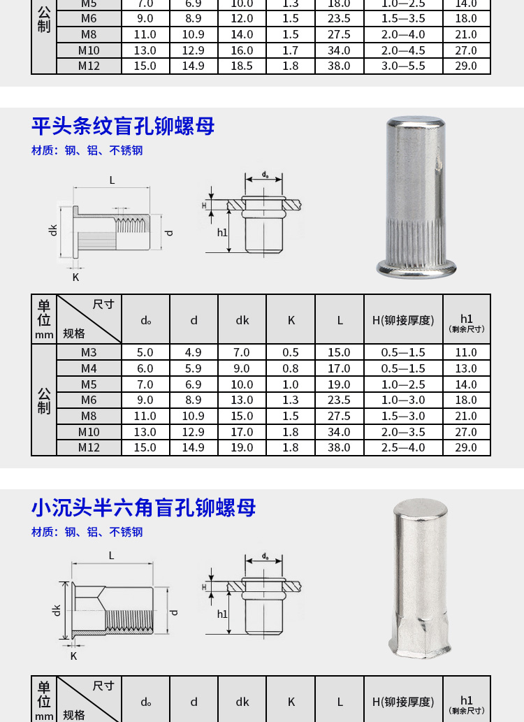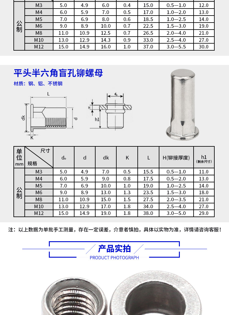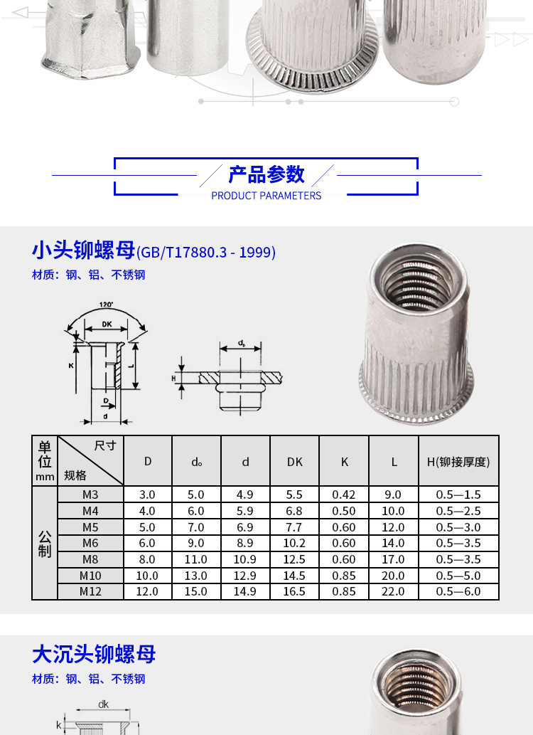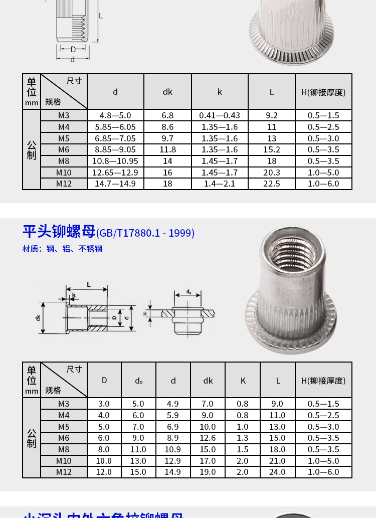 不锈钢304平头小沉头内外半六角条纹螺母拉铆螺母拉铆盲孔M4-M12