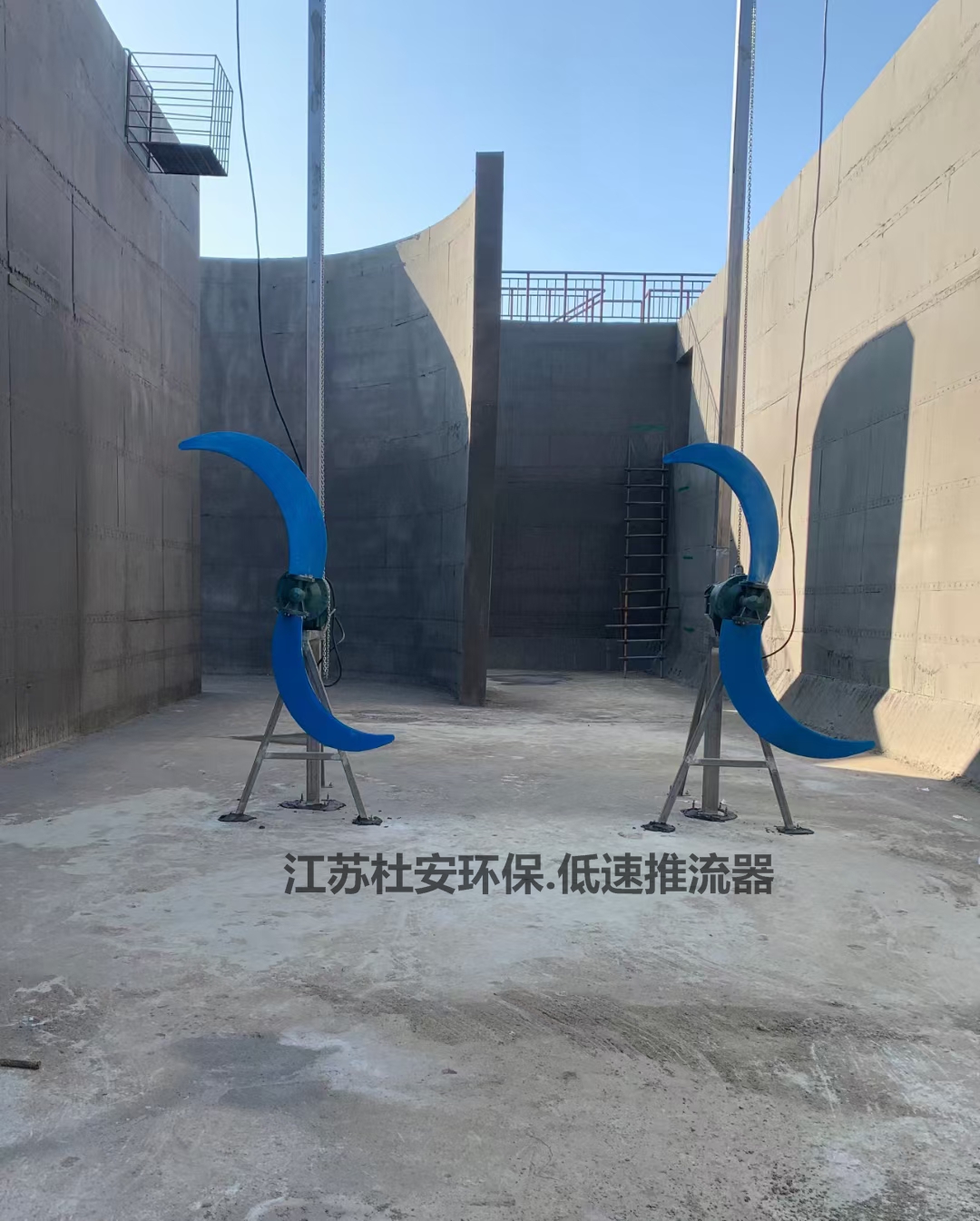 安装系统包括不锈钢基座、导轨,并配有可移动的起吊悬臂和专用的提升装置;起吊设备将提升装置沿导杆滑下便可以自动和搅拌器上的吊环扣住,配套的起吊葫芦提升低速推流器。