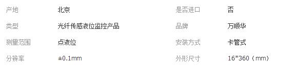产品特点:GXY-Ⅲ-C光纤传感液位监控仪,是北京万顺华科技有限公司GXY-系列点液位光纤传感液位传感器中的监控仪,由传感杆头,光电转换器和变送器3部分组成;传感杆头通过作为信号传输介质的光纤与光电转换装置联接,全光纤传感;独特探头结构设计和材质选择,使其适合大多数的工作空间环境要求。开关量输出,亦可直接选配具有常开、常闭触点继电器,驱动负载工作,制成直控液位开关;使用上极其灵活方便。材质:光电转换外壳为不锈钢或铝合金,光纤探头为PMMA或石英;工作压力可达2.5Mpa。主要特点:⑴ 灵敏度高;⑵ 抗电磁干扰,抗核辐射,电绝缘,本质安全;⑶ 防爆;⑷ 耐高温、耐高压、耐强腐蚀;⑸ 重量轻、体积小、外形可变;⑹ 耗电少;⑺ 化学性质稳定,对被测介质影响小;⑻ 光纤径细、质软,光路有可挠曲性(不带外壳);⑼ 便于与计算机连接,有利于与现有光通信技术组成遥测网和光纤传感网络。可适合各类洁净低粘度液体液位的测控;特别适合在易燃、易爆、高温、高压等场合中应用;可广泛用于化工、石油化工、化纤、化肥、食品、医药、运输及军工等行业生产、储存及运输过程中多种液体贮罐、贮槽及各种反应釜的水、油、化学试剂及酸、碱和腐蚀液等液体关键点分立液位的高精度检测、控制及监控,是目前世界上先进的界面监控仪表之一。