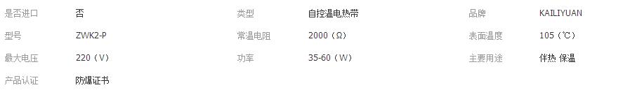 本网页所展示的有关【ZWK2-P自控温电伴热带 105度中温自限温电热带 防爆自限式加热带_电线及相关附件_天津凯利源科技有限公司】的信息/图片/参数等由全球零部件网的会员【天津凯利源科技有限公司】提供,由全球零部件网会员【天津凯利源科技有限公司】自行对信息/图片/参数等的真实性、准确性和合法性负责,本平台(本网站)仅提供展示服务,请谨慎交易,因交易而产生的法律关系及法律纠纷由您自行协商解决,本平台(本网站)对此不承担任何责任。您在本网页可以浏览【ZWK2-P自控温电伴热带 105度中温自限温电热带 防爆自限式加热带_电线及相关附件_天津凯利源科技有限公司】有关的信息/图片/价格等及提供【ZWK2-P自控温电伴热带 105度中温自限温电热带 防爆自限式加热带_电线及相关附件_天津凯利源科技有限公司】的商家公司简介、江南(中国)等信息。