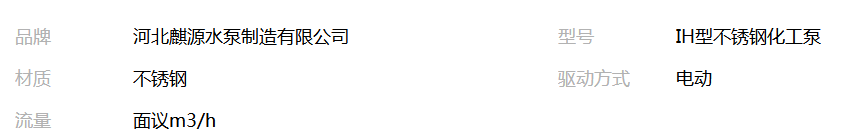 本网页所展示的有关【IH型不锈钢化工泵_泵_河北麒源水泵制造有限公司】的信息/图片/参数等由全球零部件网的会员【河北麒源水泵制造有限公司】提供,由全球零部件网会员【河北麒源水泵制造有限公司】自行对信息/图片/参数等的真实性、准确性和合法性负责,本平台(本网站)仅提供展示服务,请谨慎交易,因交易而产生的法律关系及法律纠纷由您自行协商解决,本平台(本网站)对此不承担任何责任。您在本网页可以浏览【IH型不锈钢化工泵_泵_河北麒源水泵制造有限公司】有关的信息/图片/价格等及提供【IH型不锈钢化工泵_泵_河北麒源水泵制造有限公司】的商家公司简介、江南(中国)等信息。