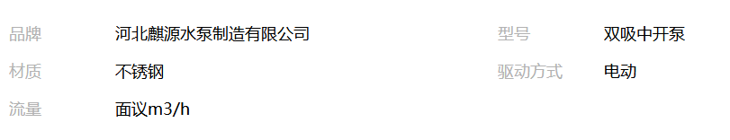 本网页所展示的有关【双吸中开泵_泵_河北麒源水泵制造有限公司】的信息/图片/参数等由全球零部件网的会员【河北麒源水泵制造有限公司】提供,由全球零部件网会员【河北麒源水泵制造有限公司】自行对信息/图片/参数等的真实性、准确性和合法性负责,本平台(本网站)仅提供展示服务,请谨慎交易,因交易而产生的法律关系及法律纠纷由您自行协商解决,本平台(本网站)对此不承担任何责任。您在本网页可以浏览【双吸中开泵_泵_河北麒源水泵制造有限公司】有关的信息/图片/价格等及提供【双吸中开泵_泵_河北麒源水泵制造有限公司】的商家公司简介、江南(中国)等信息。