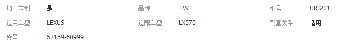 本网页所展示的有关【雷克萨斯LX570后保险杠 52159-60999_ HVAC汽车_广州市亚通太汽车配件有限公司】的信息/图片/参数等由全球零部件网的会员【广州市亚通太汽车配件有限公司】提供,由全球零部件网会员【广州市亚通太汽车配件有限公司】自行对信息/图片/参数等的真实性、准确性和合法性负责,本平台(本网站)仅提供展示服务,请谨慎交易,因交易而产生的法律关系及法律纠纷由您自行协商解决,本平台(本网站)对此不承担任何责任。您在本网页可以浏览【雷克萨斯LX570后保险杠 52159-60999_ HVAC汽车_广州市亚通太汽车配件有限公司】有关的信息/图片/价格等及提供【雷克萨斯LX570后保险杠 52159-60999_ HVAC汽车_广州市亚通太汽车配件有限公司】的商家公司简介、江南(中国)等信息。
