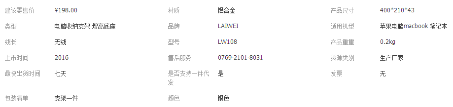 本网页所展示的有关【铝合金电脑抬高架收纳支架笔记本抬高架底座激光雷射东莞厂家包邮_综合配件_东莞市来为五金电子有限公司】的信息/图片/参数等由全球零部件网的会员【东莞市来为五金电子有限公司】提供,由全球零部件网会员【东莞市来为五金电子有限公司】自行对信息/图片/参数等的真实性、准确性和合法性负责,本平台(本网站)仅提供展示服务,请谨慎交易,因交易而产生的法律关系及法律纠纷由您自行协商解决,本平台(本网站)对此不承担任何责任。您在本网页可以浏览【铝合金电脑抬高架收纳支架笔记本抬高架底座激光雷射东莞厂家包邮_综合配件_东莞市来为五金电子有限公司】有关的信息/图片/价格等及提供【铝合金电脑抬高架收纳支架笔记本抬高架底座激光雷射东莞厂家包邮_综合配件_东莞市来为五金电子有限公司】的商家公司简介、江南(中国)等信息。