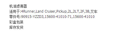 本网页所展示的有关【现货供应机油滤清器15600-41010_滤清器_上海哲荣机械配件有限公司】的信息/图片/参数等由全球零部件网的会员【上海哲荣机械配件有限公司】提供,由全球零部件网会员【上海哲荣机械配件有限公司】自行对信息/图片/参数等的真实性、准确性和合法性负责,本平台(本网站)仅提供展示服务,请谨慎交易,因交易而产生的法律关系及法律纠纷由您自行协商解决,本平台(本网站)对此不承担任何责任。您在本网页可以浏览【现货供应机油滤清器15600-41010_滤清器_上海哲荣机械配件有限公司】有关的信息/图片/价格等及提供【现货供应机油滤清器15600-41010_滤清器_上海哲荣机械配件有限公司】的商家公司简介、江南(中国)等信息。