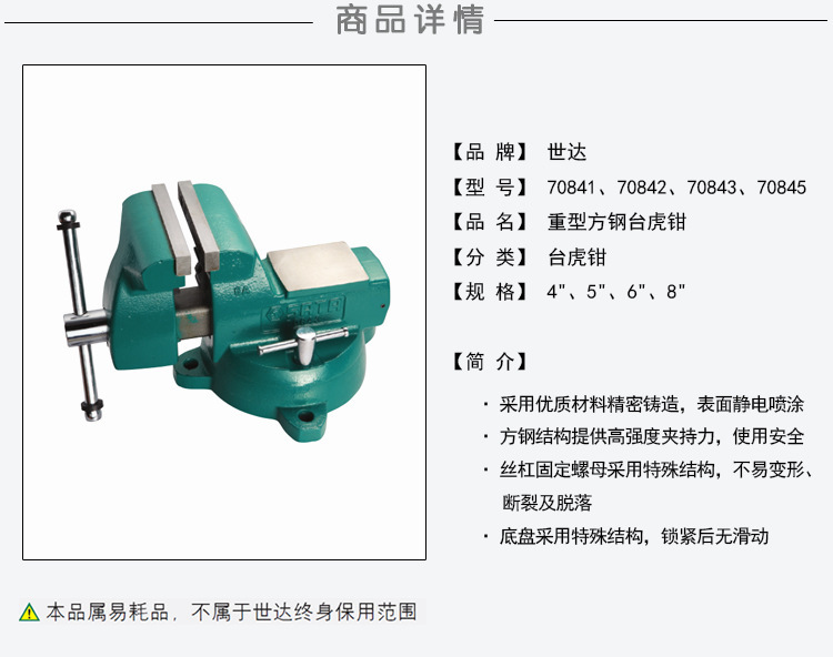 本网页所展示的有关【世达SATA重型方钢台虎钳4寸5寸6寸8寸台钳平口钳虎钳70841-70845_钳工工具_保定市久丰物资有限公司】的信息/图片/参数等由全球零部件网的会员【保定市久丰物资有限公司】提供,由全球零部件网会员【保定市久丰物资有限公司】自行对信息/图片/参数等的真实性、准确性和合法性负责,本平台(本网站)仅提供展示服务,请谨慎交易,因交易而产生的法律关系及法律纠纷由您自行协商解决,本平台(本网站)对此不承担任何责任。您在本网页可以浏览【世达SATA重型方钢台虎钳4寸5寸6寸8寸台钳平口钳虎钳70841-70845_钳工工具_保定市久丰物资有限公司】有关的信息/图片/价格等及提供【世达SATA重型方钢台虎钳4寸5寸6寸8寸台钳平口钳虎钳70841-70845_钳工工具_保定市久丰物资有限公司】的商家公司简介、江南(中国)等信息。