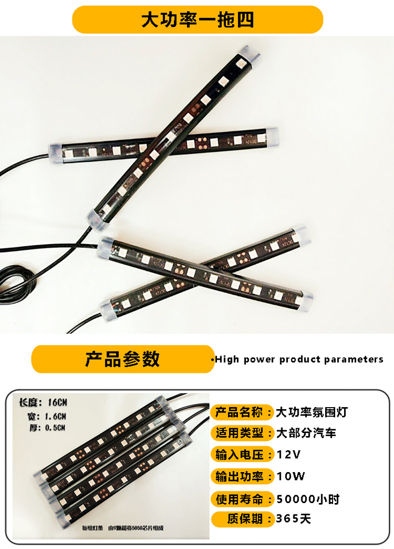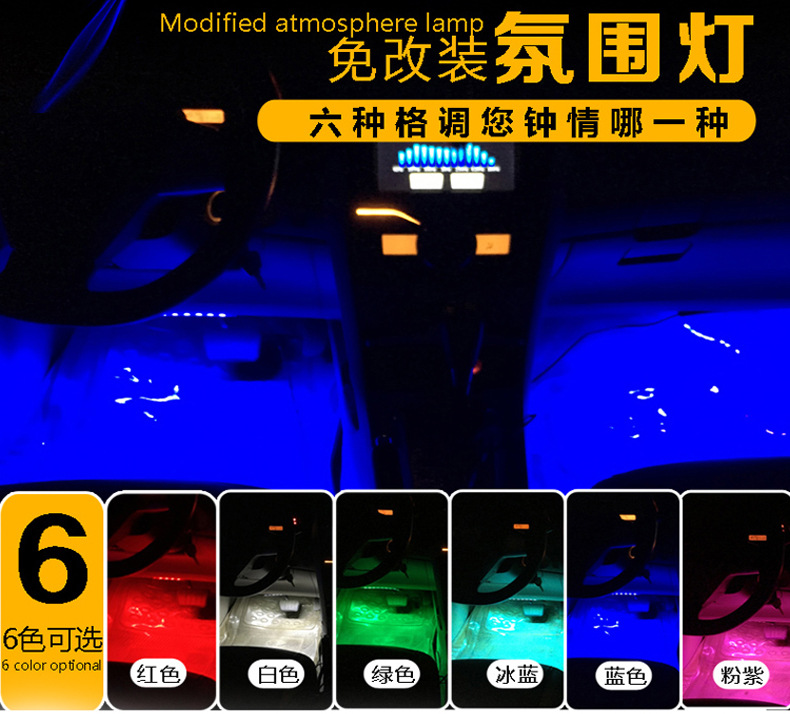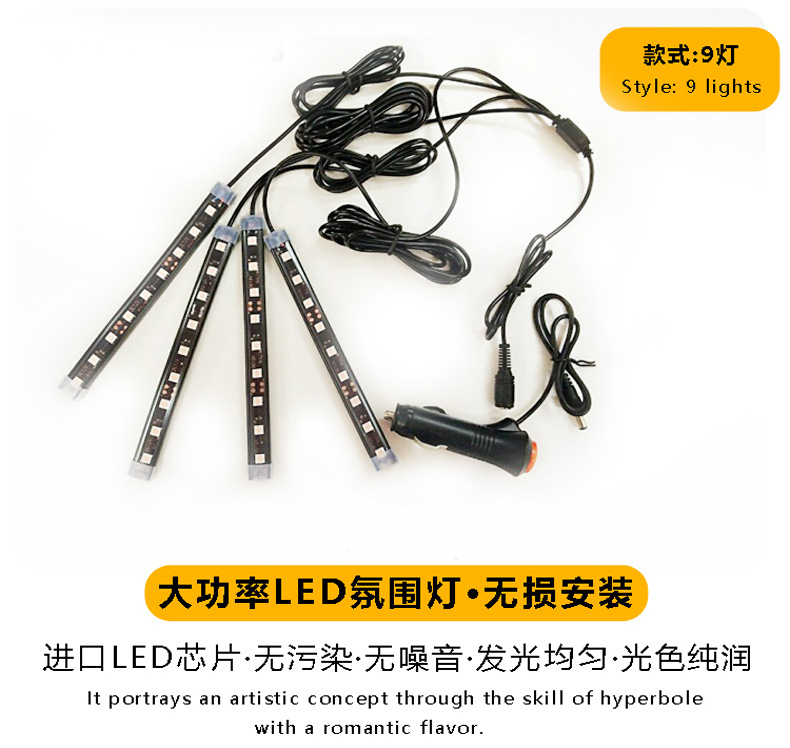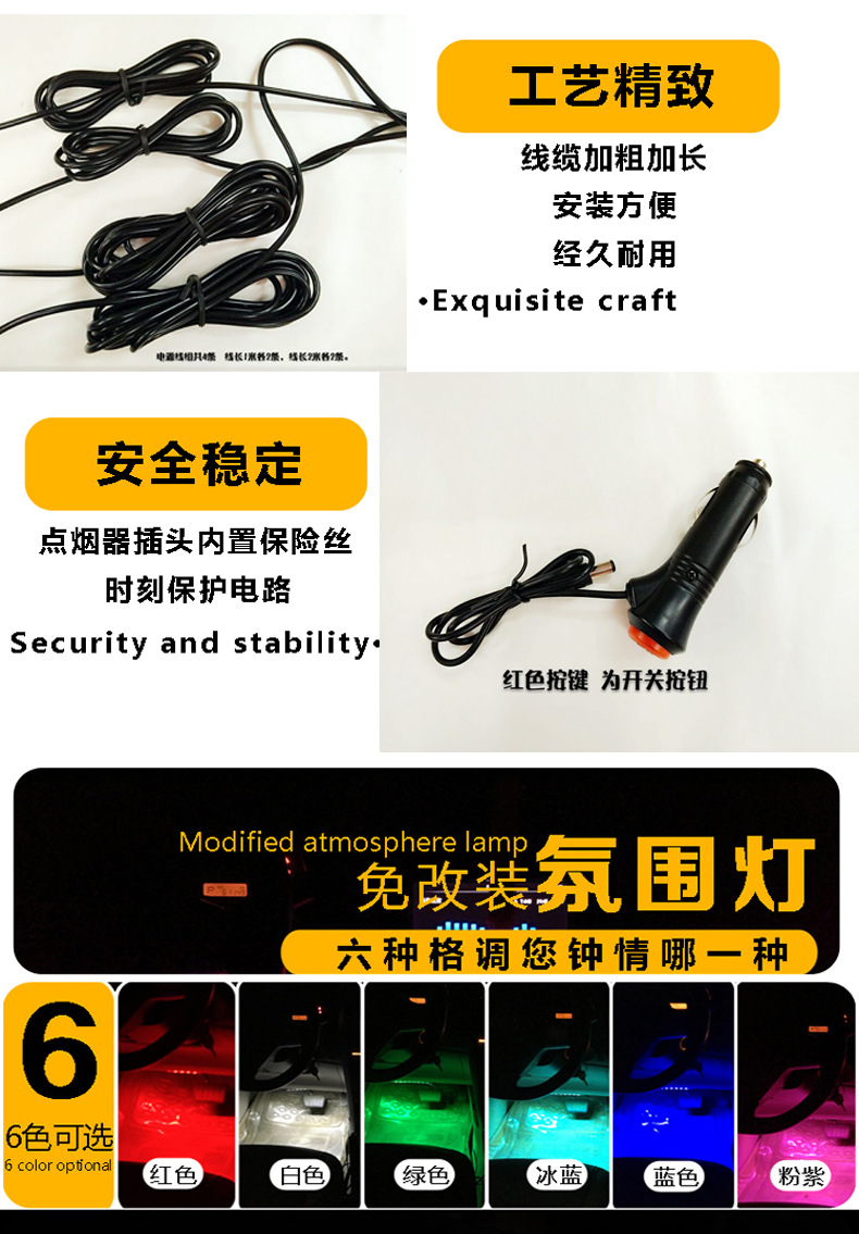 注:本款氛围灯都是配套点烟器插头的,无需接线,直插点烟器取电。一套为4组灯条。通用款,无损安装!适合大部分车型哦! 本产品价格不带包装盒