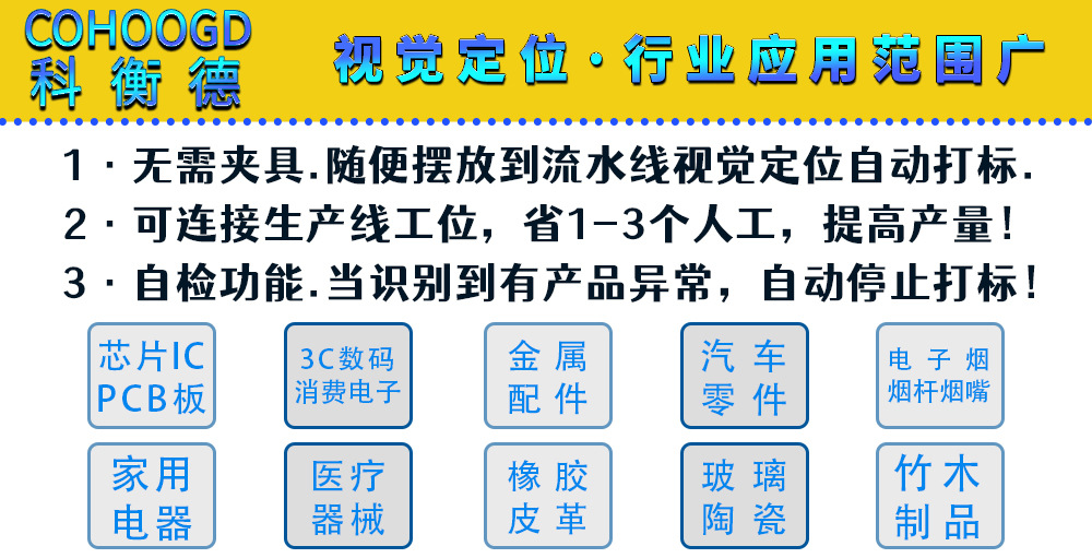 搭载2米超长输送带,可以存放更多的产品来提高生产效率,替代了传统激光打标机,在产品打标过程中无需定制夹具来实现快速精准定位,一次达标多个产品也可以进行流水线自动上料,粗略定位后,再进行视觉定位打标节省人工,提高生产效率,易于实现兼容多个产品的自动化生产流水线,为工厂节约大量成本