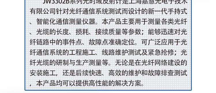 本网页所展示的有关【上海嘉慧JW3302B型OTDR光时域反射仪 光纤断点 故障测试仪_仪表类_中渠实业(上海)有限公司】的信息/图片/参数等由全球零部件网的会员【中渠实业(上海)有限公司】提供,由全球零部件网会员【中渠实业(上海)有限公司】自行对信息/图片/参数等的真实性、准确性和合法性负责,本平台(本网站)仅提供展示服务,请谨慎交易,因交易而产生的法律关系及法律纠纷由您自行协商解决,本平台(本网站)对此不承担任何责任。您在本网页可以浏览【上海嘉慧JW3302B型OTDR光时域反射仪 光纤断点 故障测试仪_仪表类_中渠实业(上海)有限公司】有关的信息/图片/价格等及提供【上海嘉慧JW3302B型OTDR光时域反射仪 光纤断点 故障测试仪_仪表类_中渠实业(上海)有限公司】的商家公司简介、江南(中国)等信息。