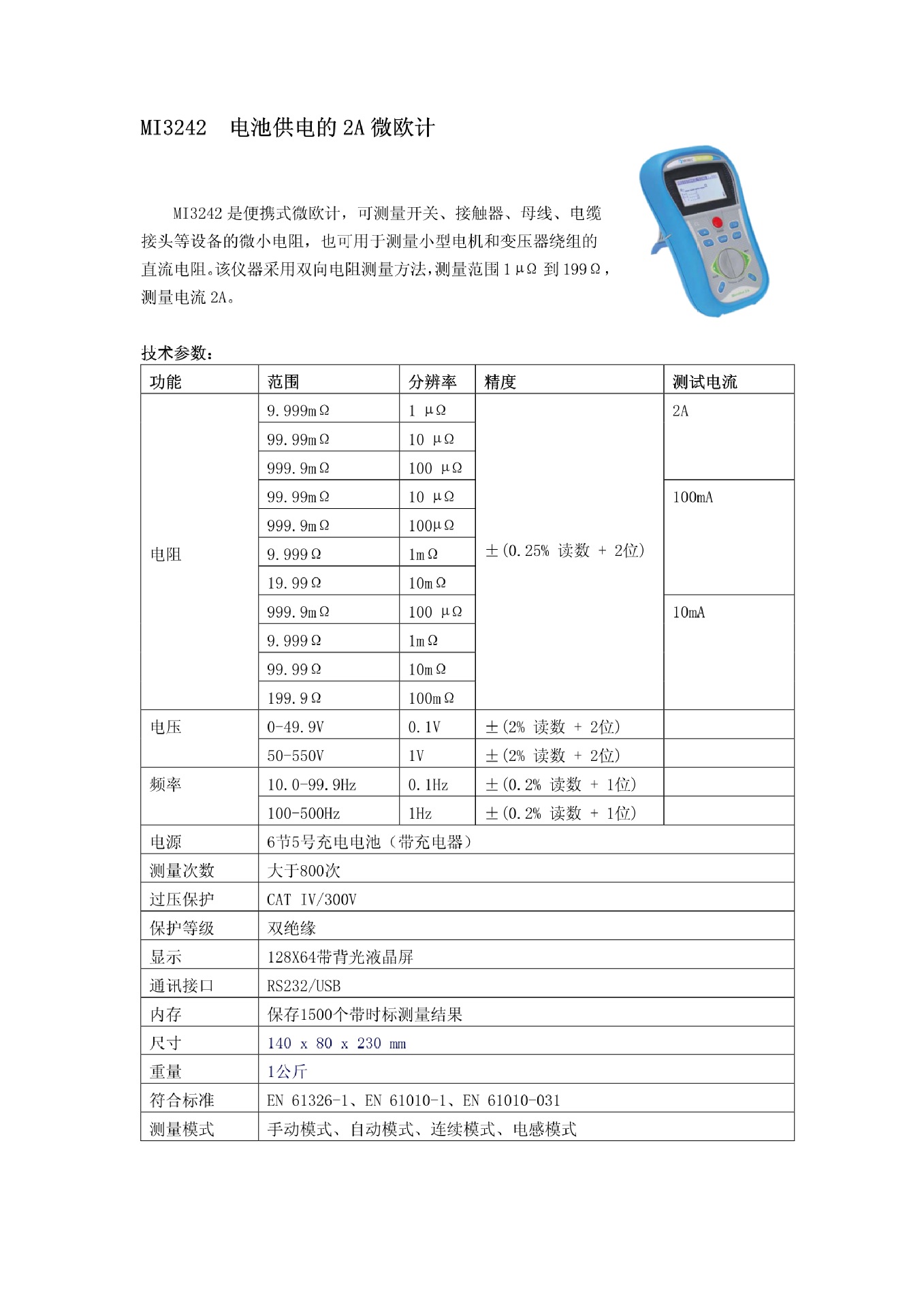 MI3242 电池供电的 2A 微欧计