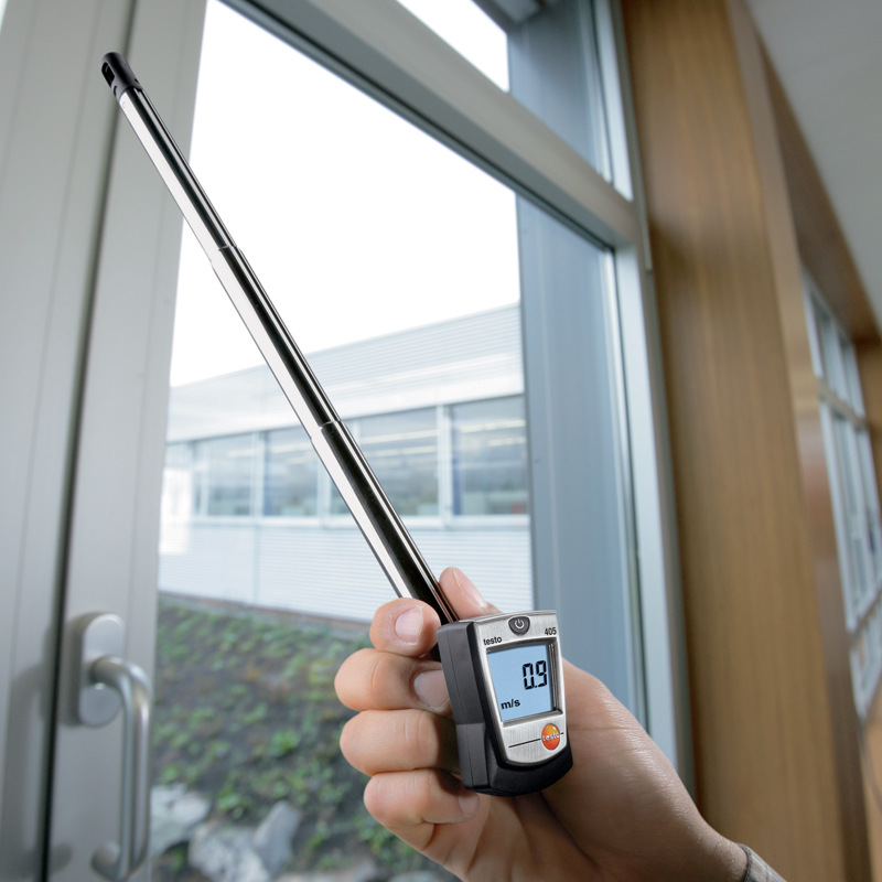 由于testo 405热线风速仪在0-2 m/s范围内的测量特别精准,您亦可用其测量室内的风速。例如,采用该风速仪可快速锁定和精准测量通风窗的低气风速度。