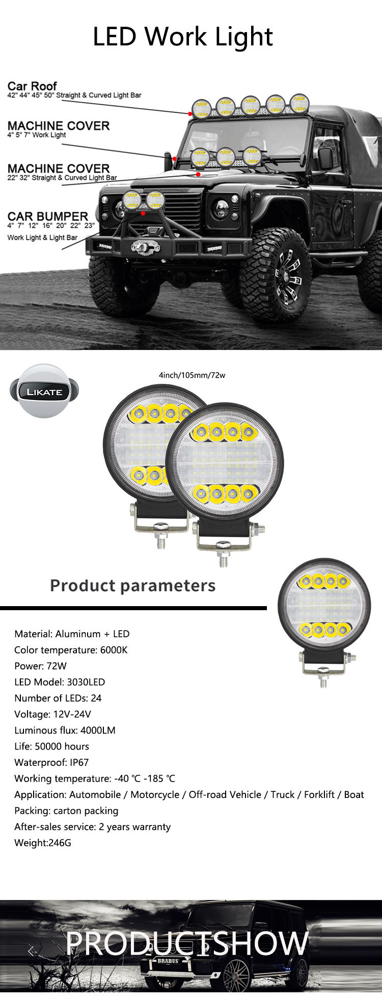 厂家直销跨境专供汽车led工作灯72w圆形越野车货车前照灯检修射灯