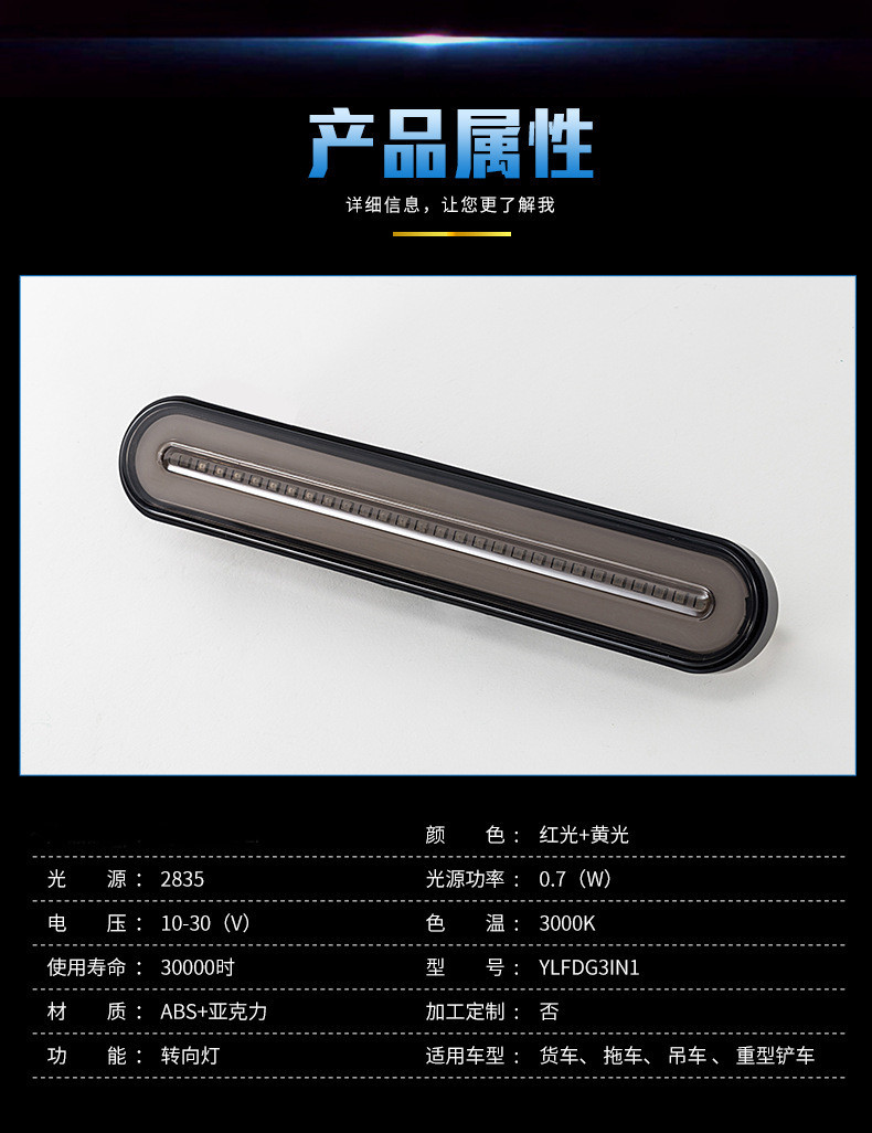 使用电压:DC12-30V;(行车灯:0.05A/0.65W;刹车灯:0.17A/2.2W;转向灯:0.28A/3.65W)