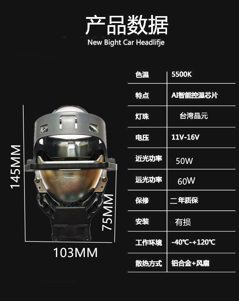 本款是新一代LED双光透镜,采用台湾车规灯珠 ,双灯杯,铺路效果更好!降温系统用 CPU级高转速滚珠风扇,散热快 使灯珠使用寿命更长!展示的产品是中性产品,如果需要我司品牌,下单时请备 注。采购10对起 可雕刻您的商标.