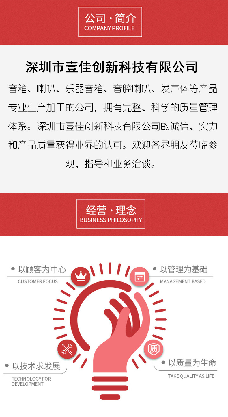 本网页所展示的有关【腔体喇叭4欧3W家用电器全音域音腔喇叭带电线改装扬声器蓝牙音箱_喇叭及配件_深圳市壹佳创新科技有限公司】的信息/图片/参数等由全球零部件网的会员【深圳市壹佳创新科技有限公司】提供,由全球零部件网会员【深圳市壹佳创新科技有限公司】自行对信息/图片/参数等的真实性、准确性和合法性负责,本平台(本网站)仅提供展示服务,请谨慎交易,因交易而产生的法律关系及法律纠纷由您自行协商解决,本平台(本网站)对此不承担任何责任。您在本网页可以浏览【腔体喇叭4欧3W家用电器全音域音腔喇叭带电线改装扬声器蓝牙音箱_喇叭及配件_深圳市壹佳创新科技有限公司】有关的信息/图片/价格等及提供【腔体喇叭4欧3W家用电器全音域音腔喇叭带电线改装扬声器蓝牙音箱_喇叭及配件_深圳市壹佳创新科技有限公司】的商家公司简介、江南(中国)等信息。