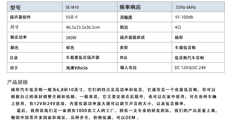 本网页所展示的有关【大功率10寸梯形车载功放低音炮超薄汽车音响改装12/24V有源低音_汽车影音娱乐_广州市索尔汽车用品有限公司】的信息/图片/参数等由全球零部件网的会员【广州市索尔汽车用品有限公司】提供,由全球零部件网会员【广州市索尔汽车用品有限公司】自行对信息/图片/参数等的真实性、准确性和合法性负责,本平台(本网站)仅提供展示服务,请谨慎交易,因交易而产生的法律关系及法律纠纷由您自行协商解决,本平台(本网站)对此不承担任何责任。您在本网页可以浏览【大功率10寸梯形车载功放低音炮超薄汽车音响改装12/24V有源低音_汽车影音娱乐_广州市索尔汽车用品有限公司】有关的信息/图片/价格等及提供【大功率10寸梯形车载功放低音炮超薄汽车音响改装12/24V有源低音_汽车影音娱乐_广州市索尔汽车用品有限公司】的商家公司简介、江南(中国)等信息。