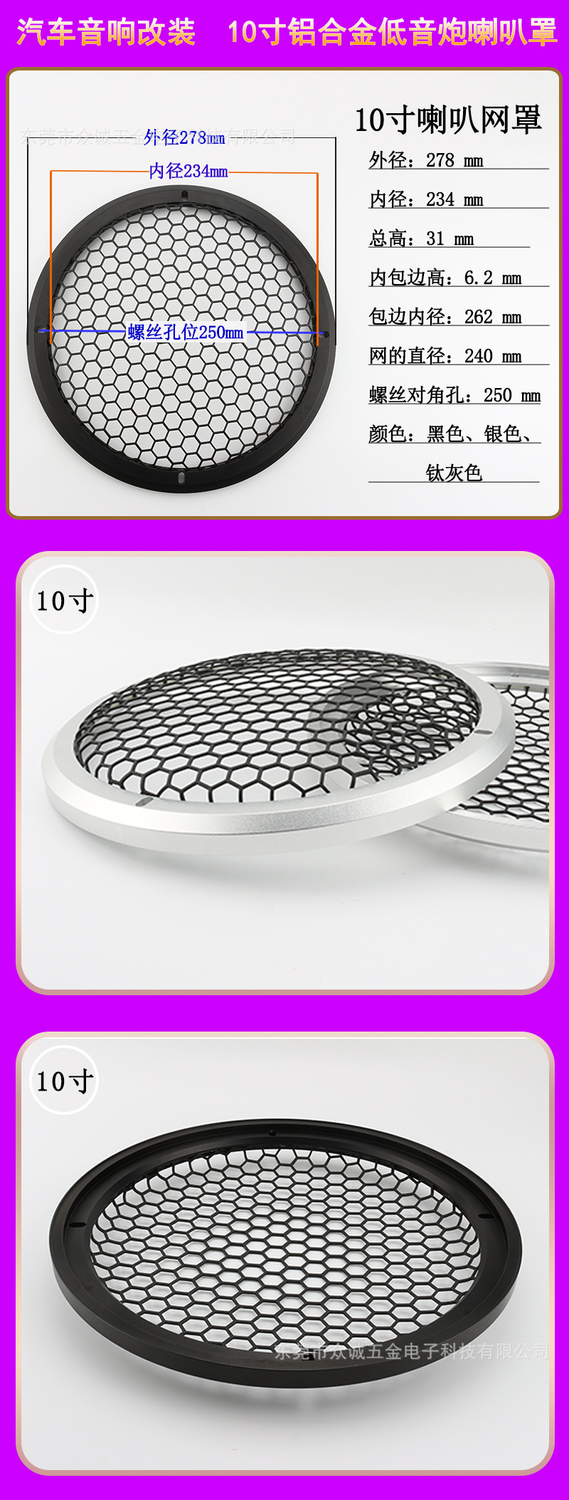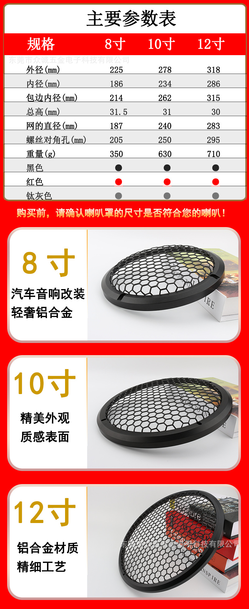 本网页所展示的有关【8寸 10寸 12 寸 汽车音响改装 家庭音箱喇叭保护网罩 铝合金材质_喇叭及配件_东莞市众诚五金电子科技有限公司】的信息/图片/参数等由全球零部件网的会员【东莞市众诚五金电子科技有限公司】提供,由全球零部件网会员【东莞市众诚五金电子科技有限公司】自行对信息/图片/参数等的真实性、准确性和合法性负责,本平台(本网站)仅提供展示服务,请谨慎交易,因交易而产生的法律关系及法律纠纷由您自行协商解决,本平台(本网站)对此不承担任何责任。您在本网页可以浏览【8寸 10寸 12 寸 汽车音响改装 家庭音箱喇叭保护网罩 铝合金材质_喇叭及配件_东莞市众诚五金电子科技有限公司】有关的信息/图片/价格等及提供【8寸 10寸 12 寸 汽车音响改装 家庭音箱喇叭保护网罩 铝合金材质_喇叭及配件_东莞市众诚五金电子科技有限公司】的商家公司简介、江南(中国)等信息。