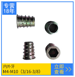 m6m8m10公制铁板螺母 英制1/4 5/16 3/8三孔圆柱螺母家具夹板螺母 规格种类全。有公制也有英制。其结构为下面3孔固定。M6(1/4)的一般是配3*15的KA自攻钉,M8(5/16)的一般是配4*20KA自攻钉。M10(3/8)的一般是配5*20KA自攻钉。更多技术及产品参数可咨询黄生。13712384605 备注:需开增值票的要另加13个点。