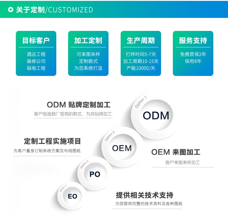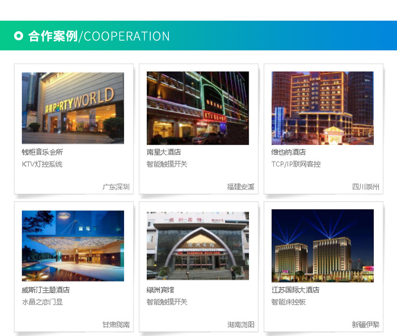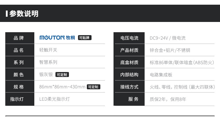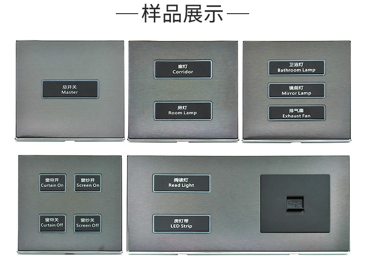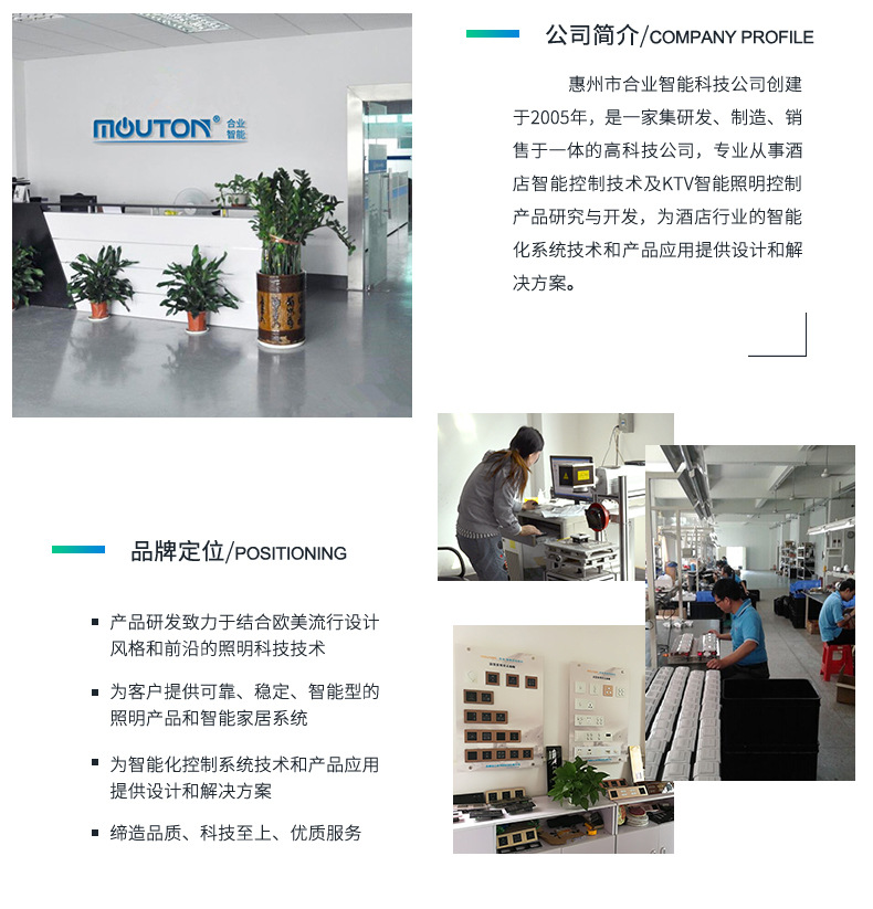 本公司主要生产酒店开关 86型墙壁开关 家用墙壁开关 wifi墙壁开关 智能轻触开关 工程智能开关 zigbee智能开关 智能温控开关 智能触摸开关,485通讯协议开关,RCU客控系统,插卡取电开关,电子门牌门铃等。欢迎新老客户定制!