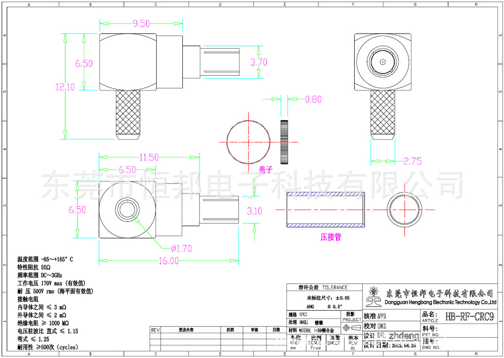 | 温度范围 -65~+165°C 特性阻抗 50Ω 频率范围 DC~3GHz 工作电压 170V max (有效值) 耐 压 500V rms (海平面有效值) 接触电阻 内导体之间 ≤ 3 mΩ 外导体之间 ≤ 2 mΩ 绝缘电阻 ≥ 1000 MΩ 电压驻波比 直式 ≤ 1.15 弯式 ≤ 1.25 耐用性 ≥500次(cycles) |