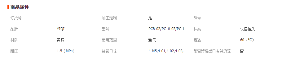 本网页所展示的有关【气动快速接头PC8-02铜外螺纹直通快插气管接头PC10-03/PC 12-04_气动接头_浙江亿启气动液压有限公司】的信息/图片/参数等由全球零部件网的会员【浙江亿启气动液压有限公司】提供,由全球零部件网会员【浙江亿启气动液压有限公司】自行对信息/图片/参数等的真实性、准确性和合法性负责,本平台(本网站)仅提供展示服务,请谨慎交易,因交易而产生的法律关系及法律纠纷由您自行协商解决,本平台(本网站)对此不承担任何责任。您在本网页可以浏览【气动快速接头PC8-02铜外螺纹直通快插气管接头PC10-03/PC 12-04_气动接头_浙江亿启气动液压有限公司】有关的信息/图片/价格等及提供【气动快速接头PC8-02铜外螺纹直通快插气管接头PC10-03/PC 12-04_气动接头_浙江亿启气动液压有限公司】的商家公司简介、江南(中国)等信息。