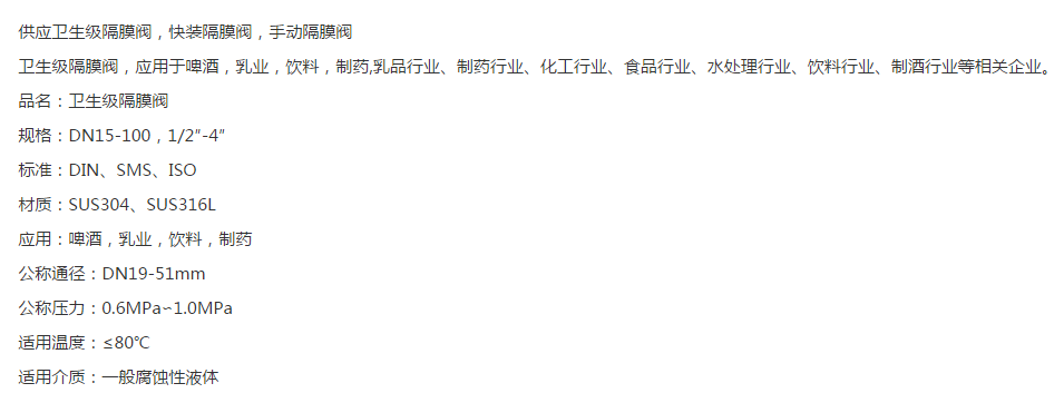 本网页所展示的有关【供应卫生级隔膜阀 卫生级快装隔膜阀 不锈钢手动隔膜阀 温州产隔膜阀_阀门_温州经济技术开发区沙城一川阀门管件加工厂】的信息/图片/参数等由全球零部件网的会员【温州经济技术开发区沙城一川阀门管件加工厂】提供,由全球零部件网会员【温州经济技术开发区沙城一川阀门管件加工厂】自行对信息/图片/参数等的真实性、准确性和合法性负责,本平台(本网站)仅提供展示服务,请谨慎交易,因交易而产生的法律关系及法律纠纷由您自行协商解决,本平台(本网站)对此不承担任何责任。您在本网页可以浏览【供应卫生级隔膜阀 卫生级快装隔膜阀 不锈钢手动隔膜阀 温州产隔膜阀_阀门_温州经济技术开发区沙城一川阀门管件加工厂】有关的信息/图片/价格等及提供【供应卫生级隔膜阀 卫生级快装隔膜阀 不锈钢手动隔膜阀 温州产隔膜阀_阀门_温州经济技术开发区沙城一川阀门管件加工厂】的商家公司简介、江南(中国)等信息。