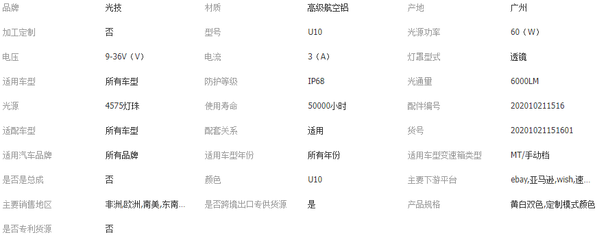 本网页所展示的有关【U10双色鱼眼透镜加装LED射灯摩托车灯 24V货车外装改装灯工作灯_汽车灯具_广州光技汽车照明有限公司】的信息/图片/参数等由全球零部件网的会员【广州光技汽车照明有限公司】提供,由全球零部件网会员【广州光技汽车照明有限公司】自行对信息/图片/参数等的真实性、准确性和合法性负责,本平台(本网站)仅提供展示服务,请谨慎交易,因交易而产生的法律关系及法律纠纷由您自行协商解决,本平台(本网站)对此不承担任何责任。您在本网页可以浏览【U10双色鱼眼透镜加装LED射灯摩托车灯 24V货车外装改装灯工作灯_汽车灯具_广州光技汽车照明有限公司】有关的信息/图片/价格等及提供【U10双色鱼眼透镜加装LED射灯摩托车灯 24V货车外装改装灯工作灯_汽车灯具_广州光技汽车照明有限公司】的商家公司简介、江南(中国)等信息。