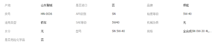 本网页所展示的有关【悍能全合成SNSLSJ汽油机油汽车发动机油高端轿车用油4L 汽车润滑油_机油_山东悍能润滑科技有限公司】的信息/图片/参数等由全球零部件网的会员【山东悍能润滑科技有限公司】提供,由全球零部件网会员【山东悍能润滑科技有限公司】自行对信息/图片/参数等的真实性、准确性和合法性负责,本平台(本网站)仅提供展示服务,请谨慎交易,因交易而产生的法律关系及法律纠纷由您自行协商解决,本平台(本网站)对此不承担任何责任。您在本网页可以浏览【悍能全合成SNSLSJ汽油机油汽车发动机油高端轿车用油4L 汽车润滑油_机油_山东悍能润滑科技有限公司】有关的信息/图片/价格等及提供【悍能全合成SNSLSJ汽油机油汽车发动机油高端轿车用油4L 汽车润滑油_机油_山东悍能润滑科技有限公司】的商家公司简介、江南(中国)等信息。