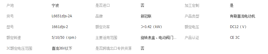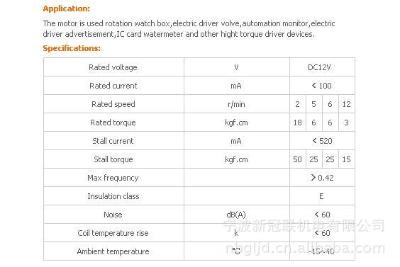 额定电压:12V 额定电流<100mA 额定转速:5、10、50r/min 额定转矩:10、5、1kgf.cm