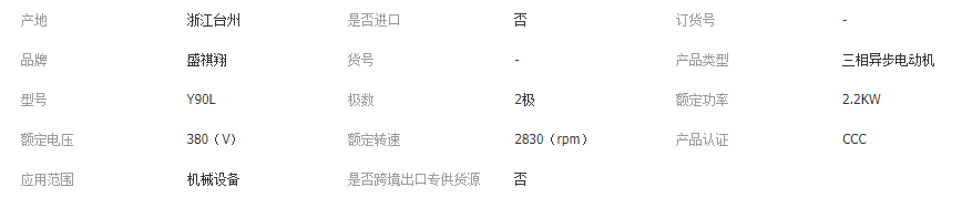 本网页所展示的有关【供应电机Y90L-2 2.2KW 3Kw 4kw 5.5三相异步电动机 马达_交流电机_南京盛祺翔电机有限公司】的信息/图片/参数等由全球零部件网的会员【南京盛祺翔电机有限公司】提供,由全球零部件网会员【南京盛祺翔电机有限公司】自行对信息/图片/参数等的真实性、准确性和合法性负责,本平台(本网站)仅提供展示服务,请谨慎交易,因交易而产生的法律关系及法律纠纷由您自行协商解决,本平台(本网站)对此不承担任何责任。您在本网页可以浏览【供应电机Y90L-2 2.2KW 3Kw 4kw 5.5三相异步电动机 马达_交流电机_南京盛祺翔电机有限公司】有关的信息/图片/价格等及提供【供应电机Y90L-2 2.2KW 3Kw 4kw 5.5三相异步电动机 马达_交流电机_南京盛祺翔电机有限公司】的商家公司简介、江南(中国)等信息。