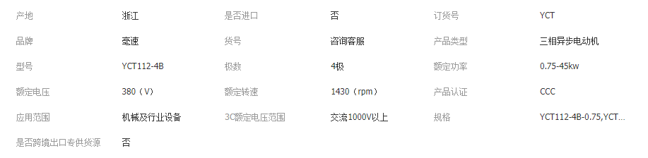 本网页所展示的有关【4极YCT电磁调速电机 0.75千瓦-45千瓦三相异步电动机380V交流电机_直流电机_上海亳速电机有限公司】的信息/图片/参数等由全球零部件网的会员【上海亳速电机有限公司】提供,由全球零部件网会员【上海亳速电机有限公司】自行对信息/图片/参数等的真实性、准确性和合法性负责,本平台(本网站)仅提供展示服务,请谨慎交易,因交易而产生的法律关系及法律纠纷由您自行协商解决,本平台(本网站)对此不承担任何责任。您在本网页可以浏览【4极YCT电磁调速电机 0.75千瓦-45千瓦三相异步电动机380V交流电机_直流电机_上海亳速电机有限公司】有关的信息/图片/价格等及提供【4极YCT电磁调速电机 0.75千瓦-45千瓦三相异步电动机380V交流电机_直流电机_上海亳速电机有限公司】的商家公司简介、江南(中国)等信息。